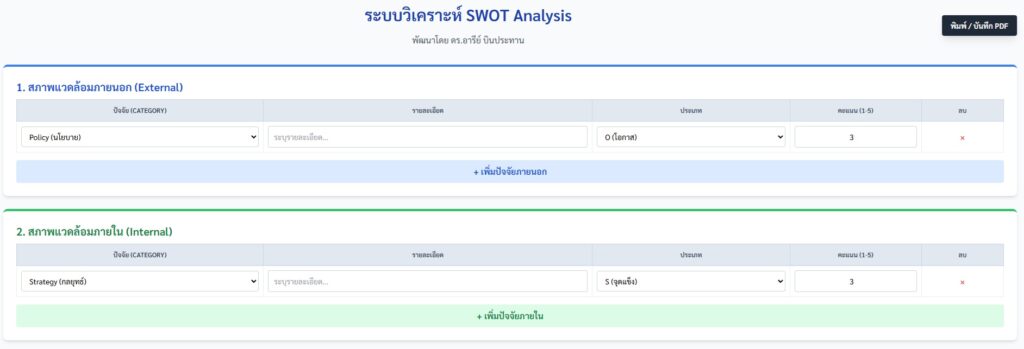 - 1. สภาพแวดล้อมภายนอก (External): ผู้ใช้สามารถเลือกปัจจัยจากรายการมาตรฐาน PESTEL (Policy, Economic, Social, Technology, Environment, Legal)